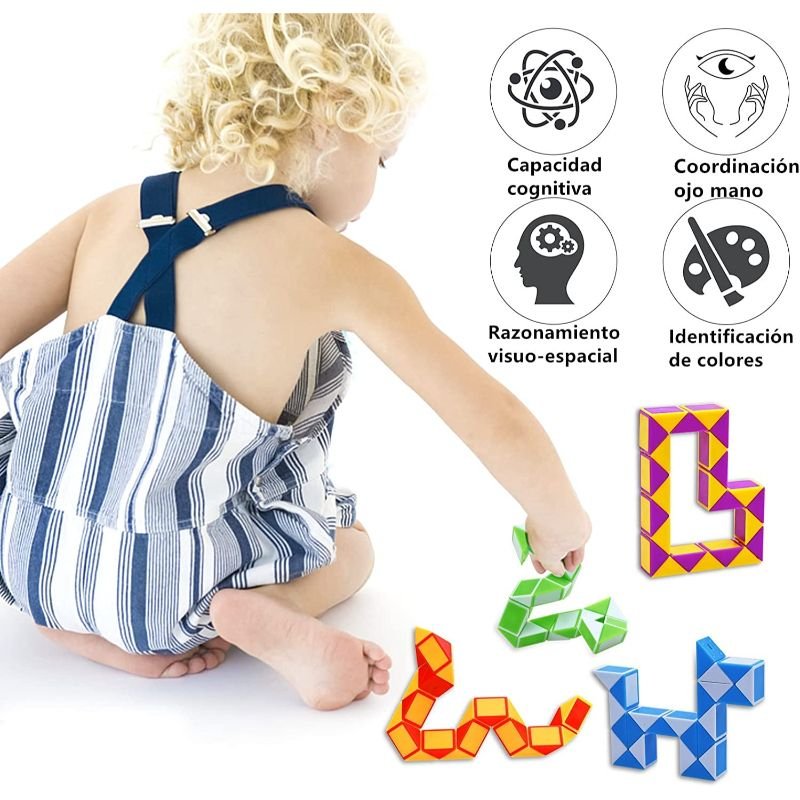 Este set de Cubos Mágico de Serpiente es perfecto como regalo para fiestas infantiles. Además, cada cubo viene en colores vibrantes y variados, lo que les ayuda a desarrollar su sensibilidad al color.