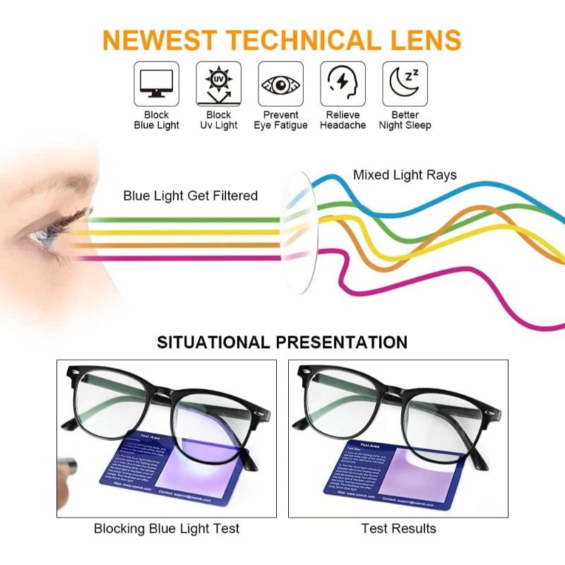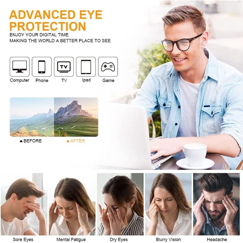 Alivia la fatiga ocular: Nuestras gafas bloquean eficazmente la luz azul dañina, aliviando la fatiga ocular causada por el uso de teléfonos móviles, tabletas y computadoras. Protege tus ojos y asegura la eficiencia en tu trabajo durante el día, y un sueño de calidad por la noche.