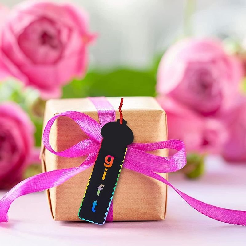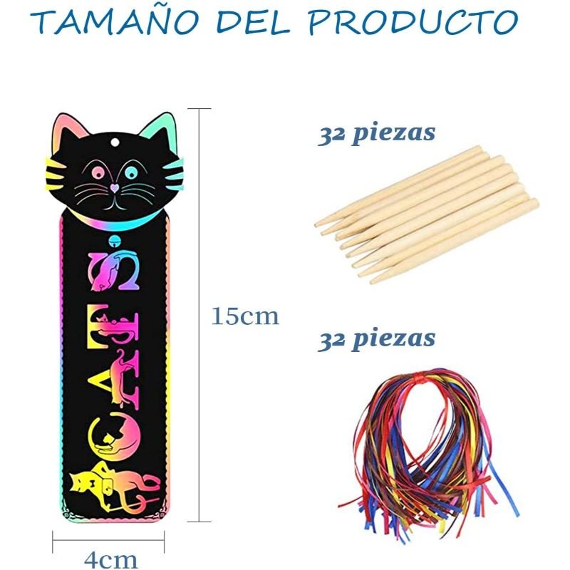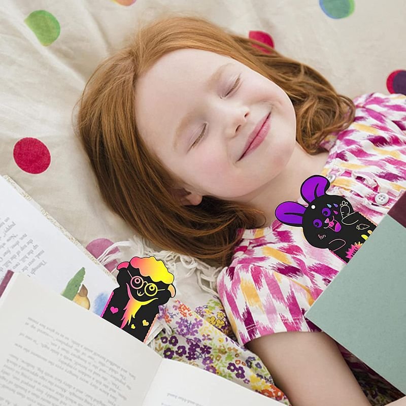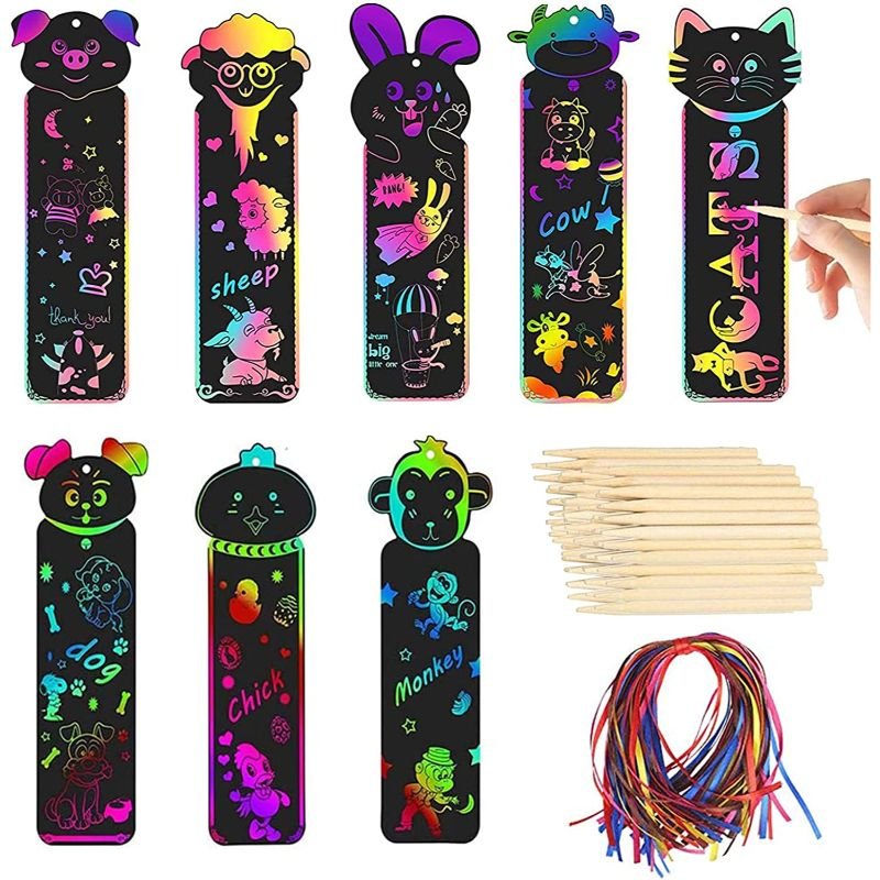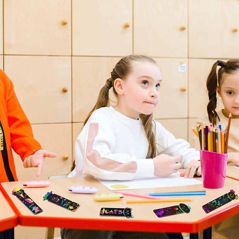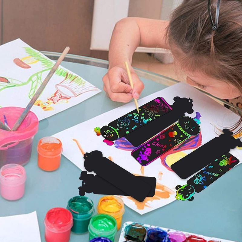 Es fácil de usar: simplemente usa el lápiz para rascar la superficie negra y revelar los colores brillantes del arco iris debajo. Además, la cinta de colores te permite colgar tus obras de arte y completar marcadores de arte creativos.
